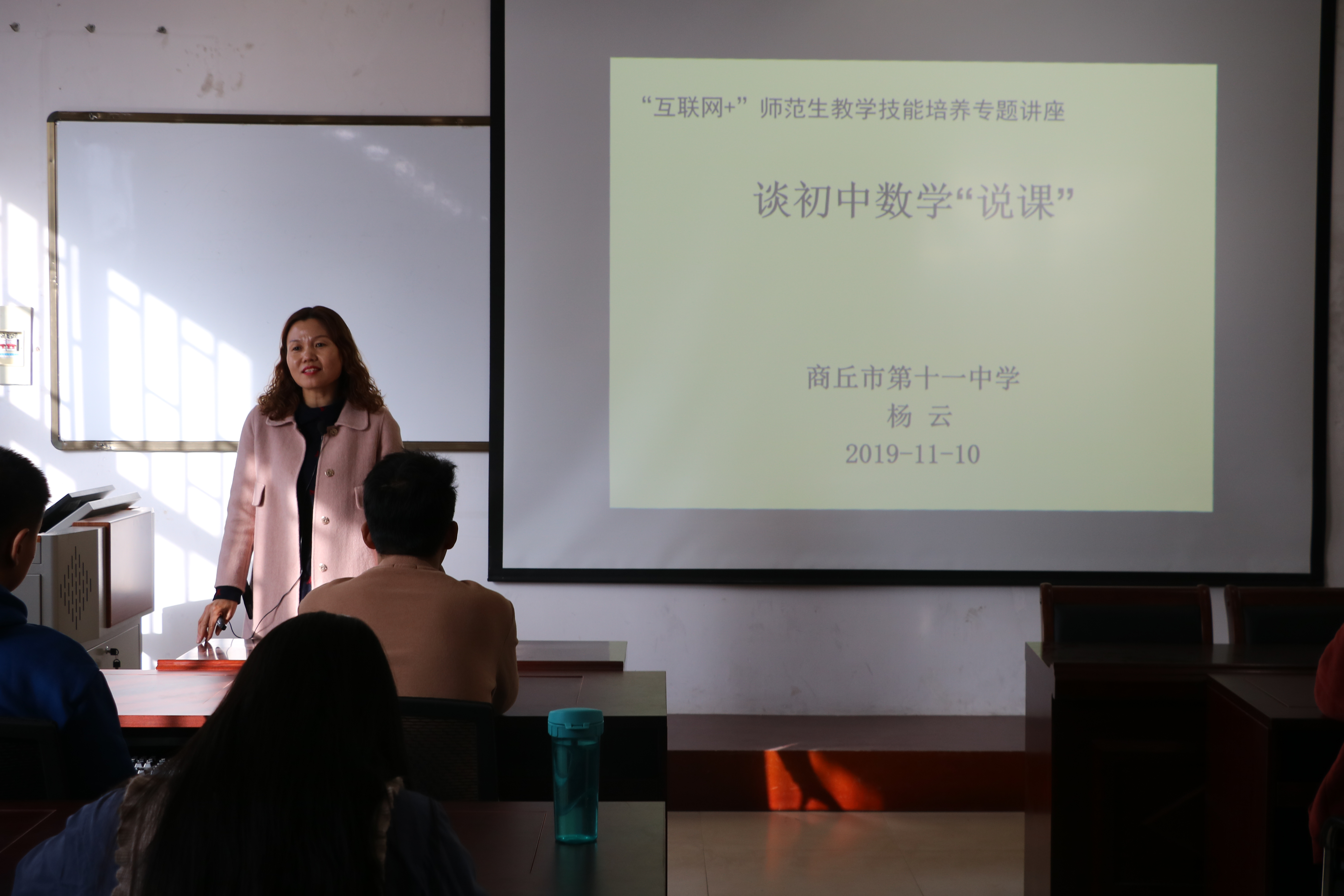 为切实提高师范生的说课能力,11月10日上午九点英国威廉希尔公司“互联网+师范生技能培养”专题讲座之谈初中数学“说课”在睢阳校区办公楼二楼208教室举行。本次活动由英国威廉希尔公司副院长张斐然,工作坊负责人姜素华、黄丽芝老师及商丘市实验中学刘菲老师出席,全体坊员参加。讲座由商丘市第十一中学教学名师杨云老师主讲。