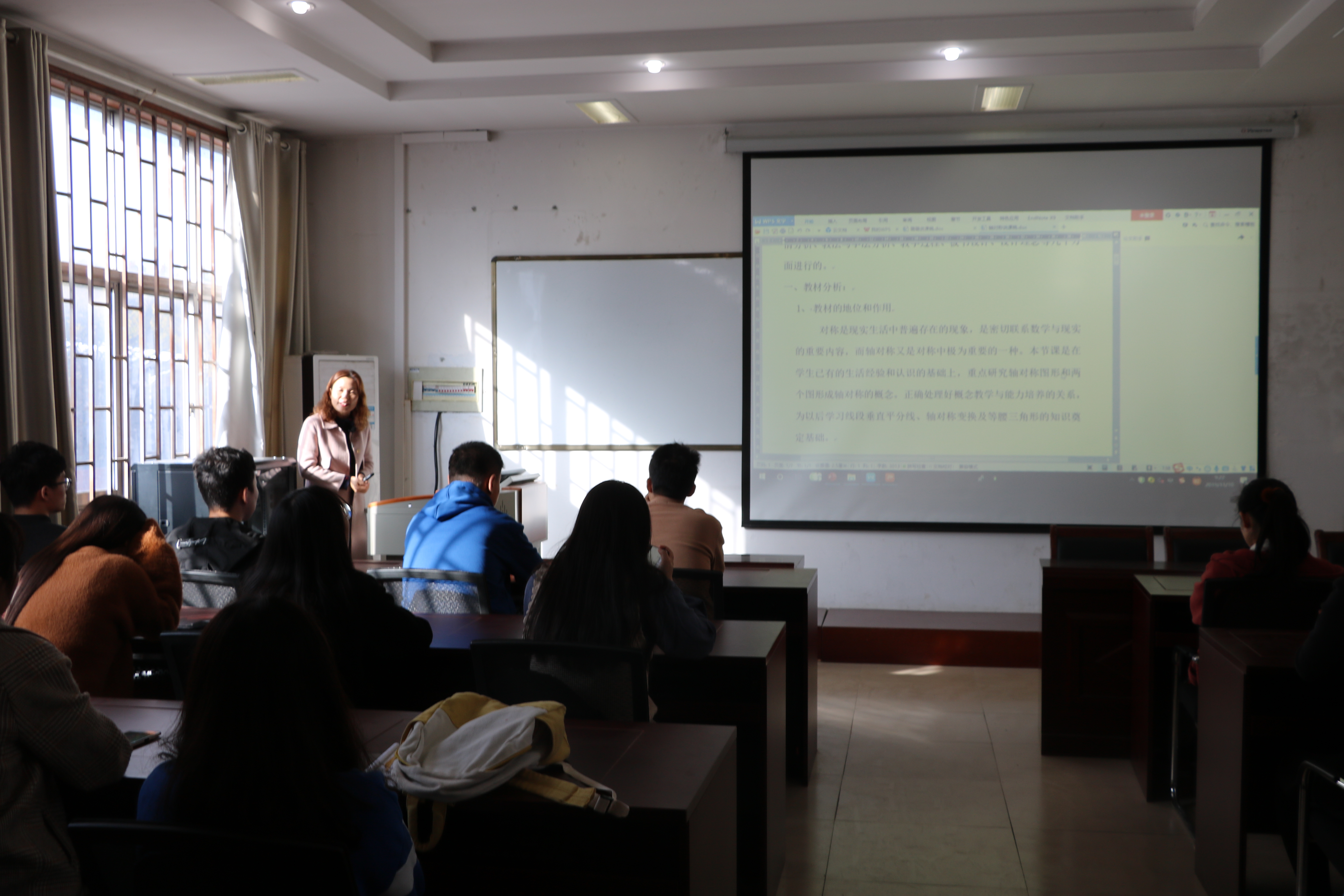 本次讲座以“谈初中数学说课”为主题,杨云老师首先讲述了一段自己的说课经历,深入浅出的引出了说课的重要性。随后,她从说课及要素、说课基本内容、说课的方法与技巧、说课的基本原则、正确理解说课和优秀案例赏析六个方面对说课进行详细的解说。在讲授过程中,杨云老师提出要明确教学理念、说课内容要详略得当,教学语言要生动形象,灵活安排说课内容等多个要点。讲座最后,杨云老师通过全面的分析,讲述自己对说课的独特认知,给学生们上了一堂生动的课。