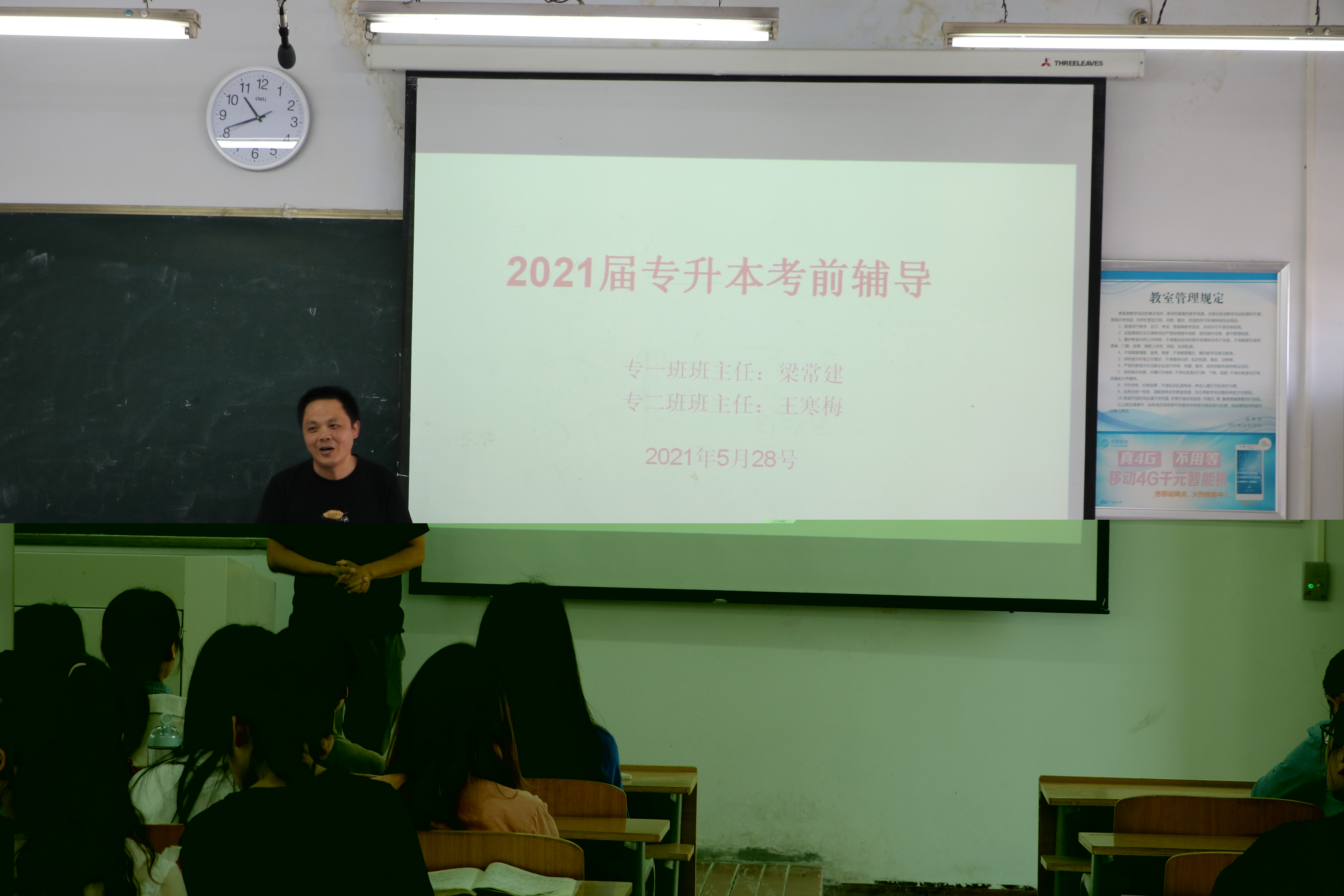 此次辅导会议上,班主任梁常建、王寒梅对全院117名学生进行专升本考试政策方向及学习方法指导。两位老师结合最新政策和历年录取情况,为同学们深入分析了考前注意事项和今后的报考形势。随后,介绍了专升本考试的报考条件、考试科目、时间安排、录取方式及注意事项,对2021年参加专升本考试的同学进行网上志愿填报模拟演练,使同学们加深了对专升本整个考试流程的认识。梁常建老师重点强调了考试违纪的若干问题对学生们进行考前诚信教育,以此告诫大家要守住道德底线,勿碰纪律红线,嘱咐同学们在认真复习、积极备考的同时要提高个人心理素质,注意劳逸结合,适当减压、合理调控情绪,养成良好的作息习惯,并预祝同学们取得理想的成绩。