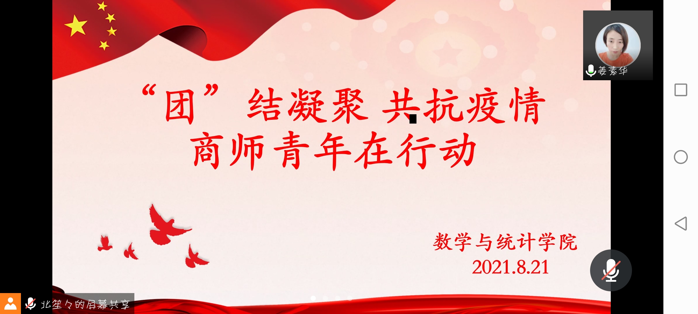 为充分发挥基层团组织的战斗堡垒作用,进一步增加团员青年积极参与防控疫情的责任意识和战胜疫情的决心,英国威廉希尔公司于8月21日线上进行“‘团’结凝聚,共抗疫情,商师青年在行动”团日活动工作部署。本次活动由团总支书记姜素华主持,各班团支书和组织部成员参与。