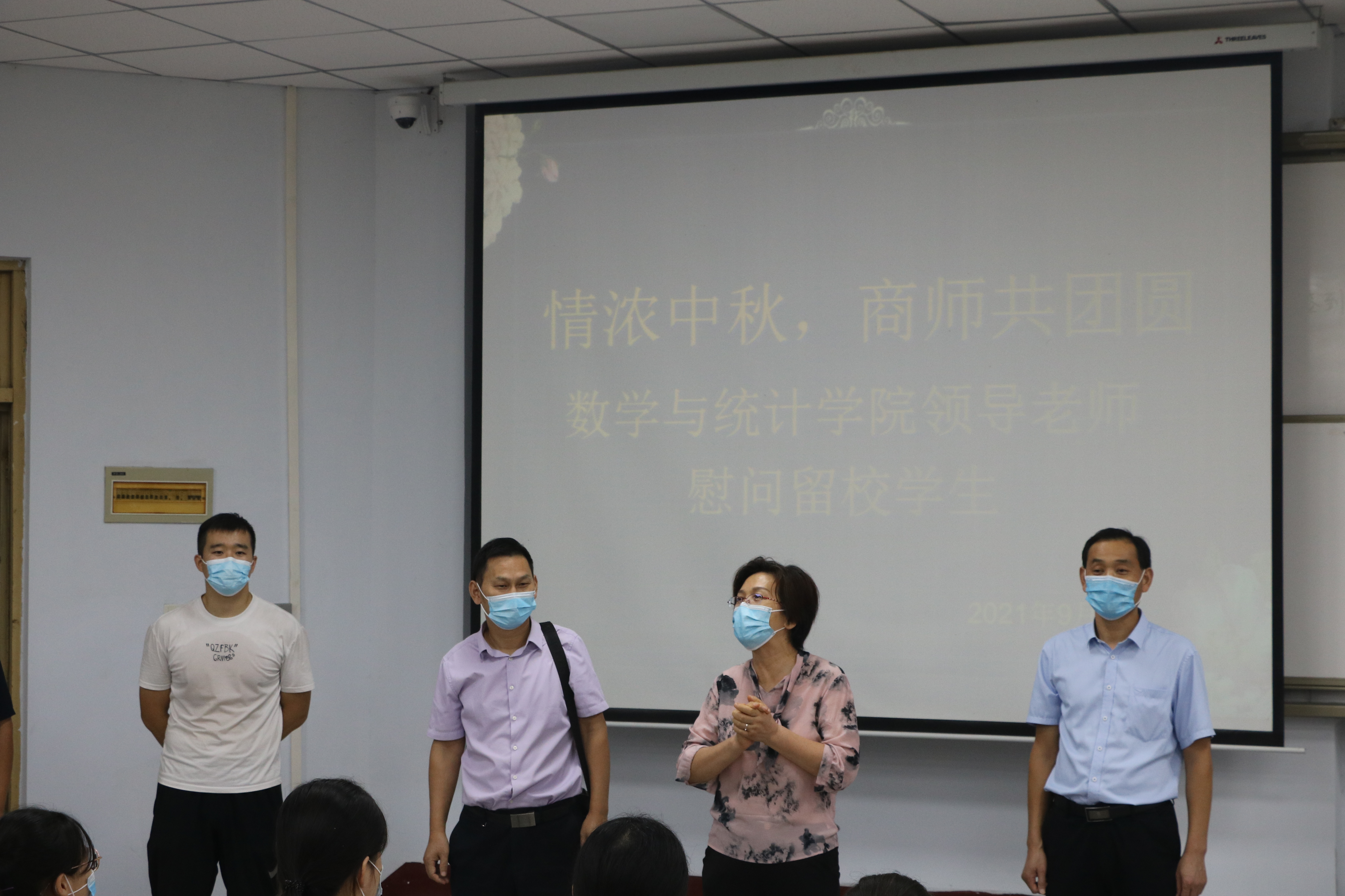 在中秋国庆双节来临之际,为营造祥和愉悦的节日氛围,让留校学生在学校欢度佳节、感受家的温暖。2021年9月18日下午6点,英国威廉希尔公司党委书记孟学超,院长张斐然,党委副书记陈树艳,副院长刘磊,团总支书记姜素华及18级辅导员李昊阳前往教学楼108教室为留校学生送去月饼和节日祝福。