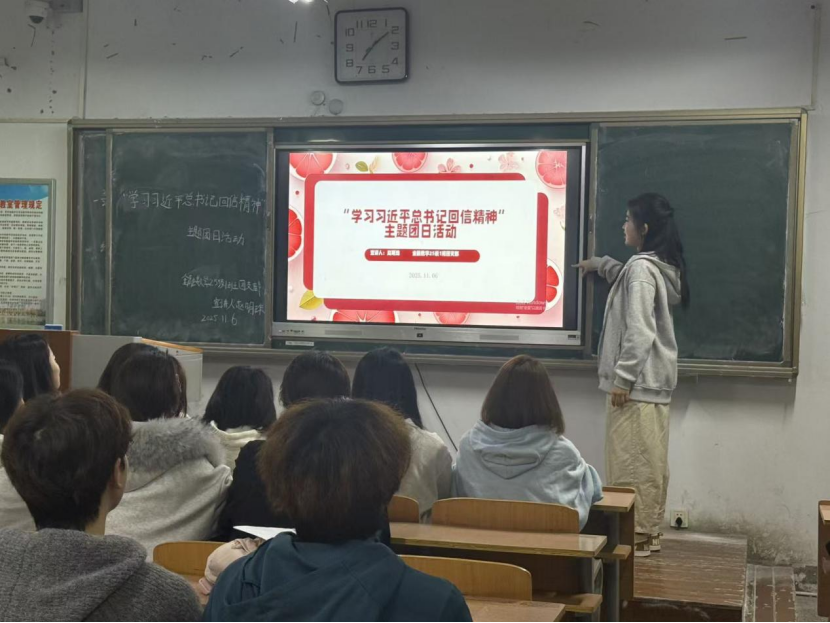 活动伊始,金融数学25级1班团支书赵明珠带领同学们学习习近平总书记重要回信原文,学习其内涵并阐释了习近平总书记对青年的殷切期望。随后,数学与应用数学25级2班团支书刘梦娜从践行重要讲话精神方面,引导同学们思考如何将回信精神转化为实际行动,鼓励大家积极投身志愿服务、西部计划等为建设祖国贡献自己的力量。最后,数学与应用数学25级1班团支书丁涣懿剖析回信精神的时代意义,结合强国复兴背景讲解青年责任与担当,启发同学们将个人理想与国家命运相连,在学思践悟中实现个人价值与国家需求同频共振。