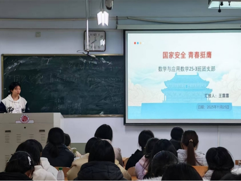 活动伊始,数学与应用数学25级3班团支书王露露带领同学们系统学习了习近平总书记关于总体国家安全观的重要论述,深入阐释了国家安全的丰富内涵与时代意义。随后,金融数学25级1班团支书赵明珠结合网络谣言、信息泄露等贴近学生生活的实际案例,剖析了当前多个领域面临的国家安全风险,增强了同学们的防范意识。最后,数学与应用数学24级2班团支书王馨悦就《国家安全法》的核心内容进行讲解,引导同学们从多维度分析国家安全问题,探讨应对策略,切实提升了大家依法维护国家安全的能力与自觉。